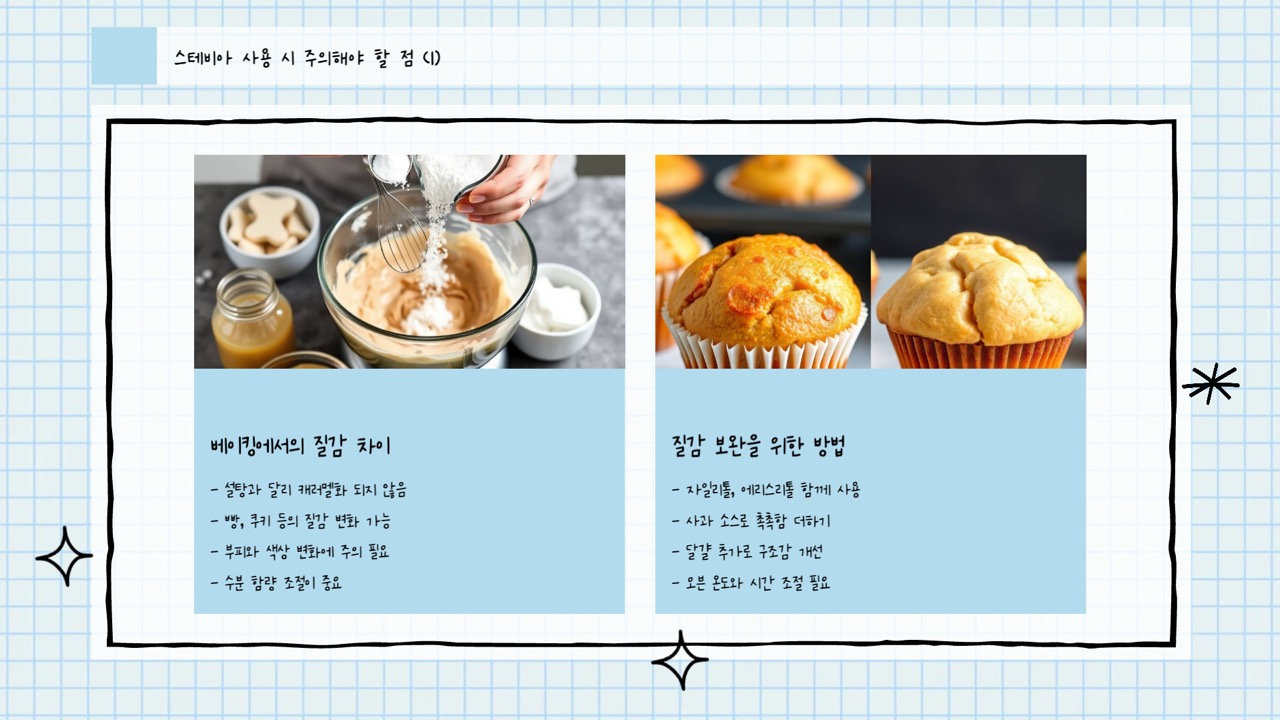 - 베이킹에서 질감 차이: 설탕은 굽는 과정에서 캐러멜화되어 질감을 형성하지만, 스테비아는 그렇지 않습니다. 따라서 빵이나 쿠키를 만들 때는 자일리톨이나 에리스리톨 같은 감미료와 함께 사용하면 더 자연스러운 맛을 낼 수 있습니다.