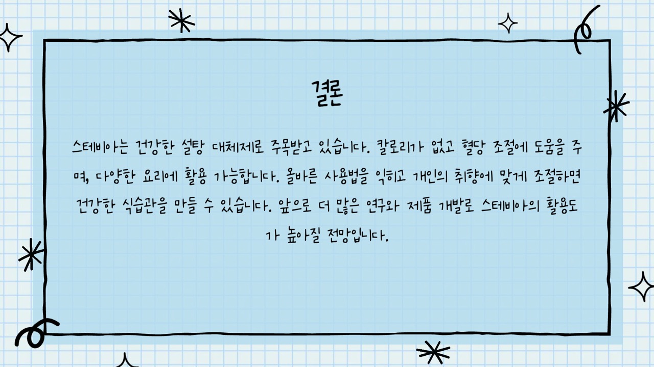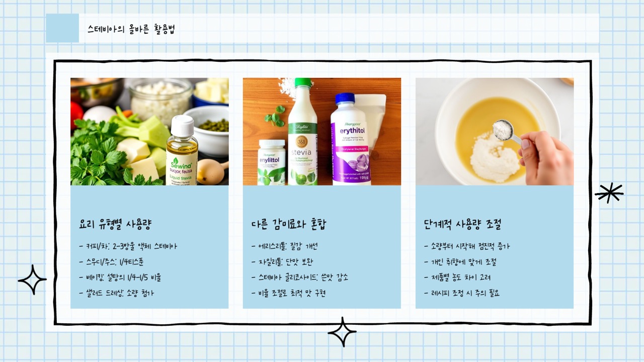 스테비아는 설탕을 대체할 수 있는 건강한 감미료로, 적절한 비율을 사용하면 맛을 해치지 않으면서도 건강을 유지할 수 있습니다. 요리에 따라 다른 감미료와 혼합하면 더욱 자연스러운 단맛을 낼 수 있으며, 처음 사용할 때는 소량부터 시작하는 것이 좋습니다. 스테비아를 올바르게 활용해 건강한 식습관을 만들어 보세요!