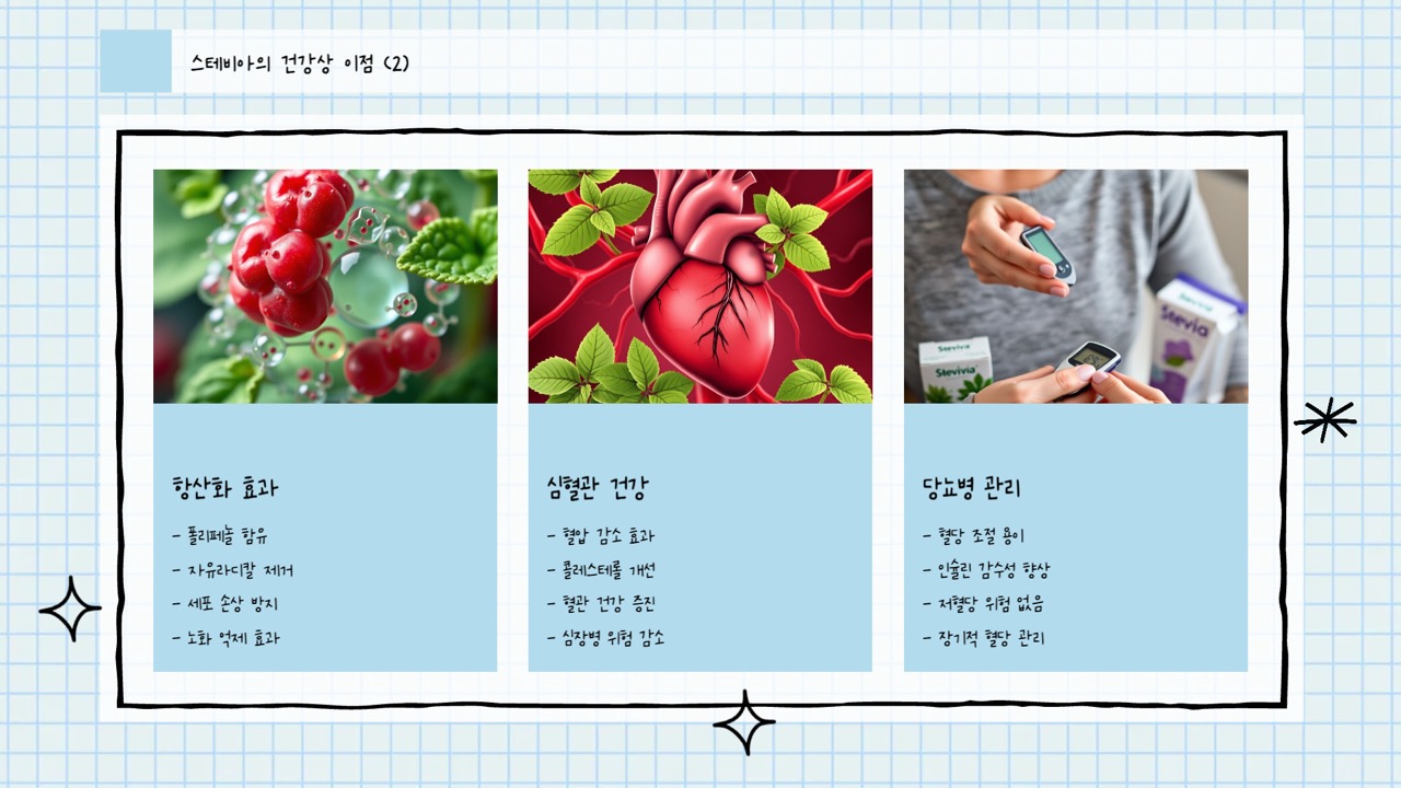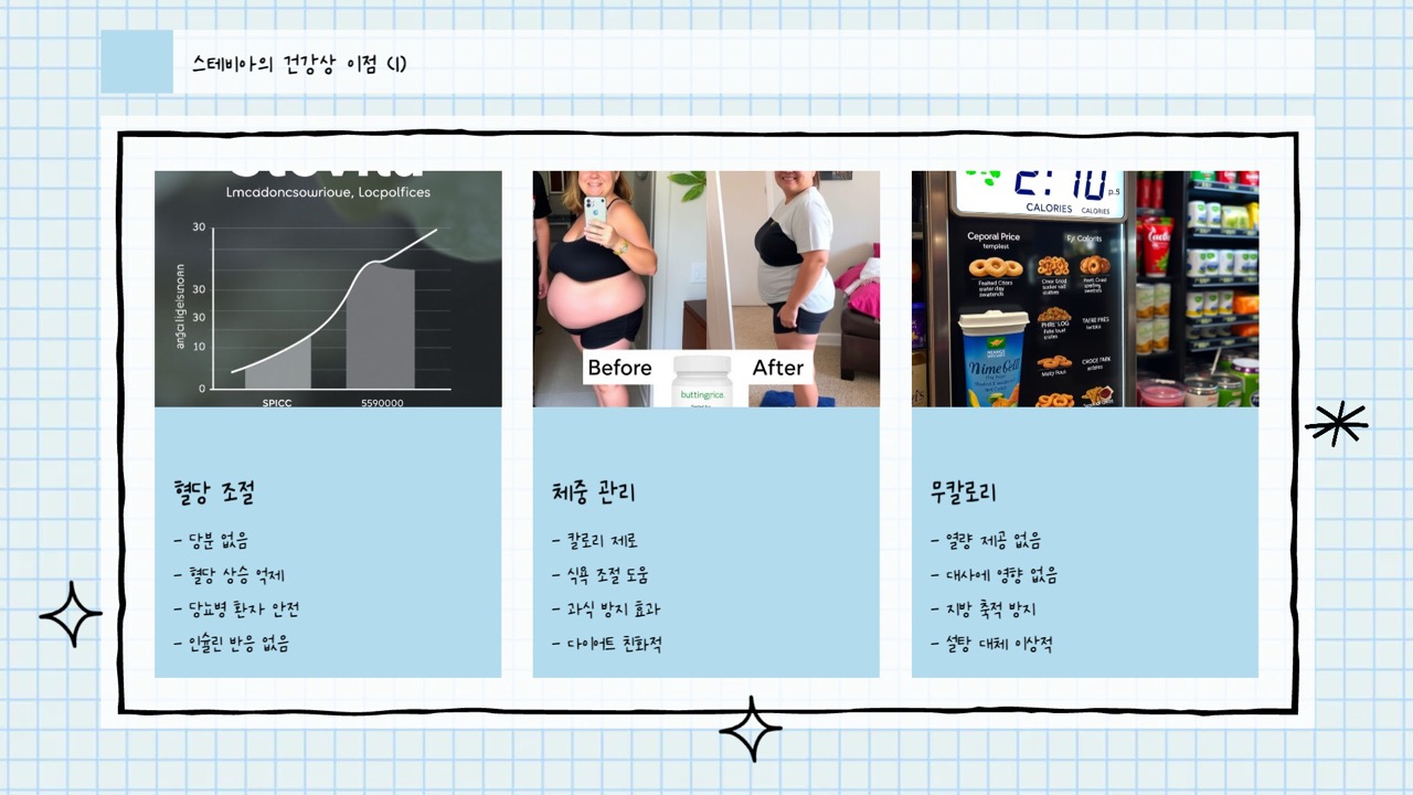 스테비아는 설탕을 대체할 수 있는 건강한 감미료로, 다음과 같은 장점이 있습니다.