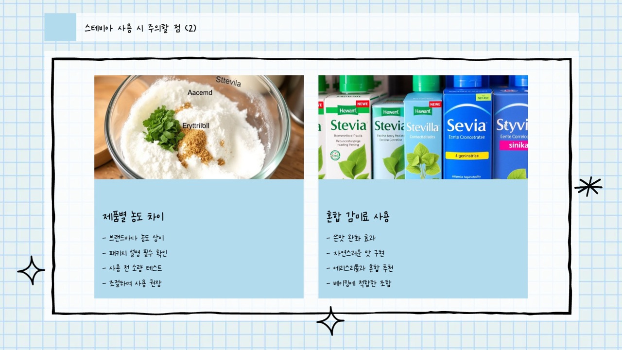 - 일부 제품의 쓴맛: 스테비아의 종류에 따라 뒷맛이 남을 수 있으므로, 부드러운 맛을 위해 혼합 감미료를 사용하는 것이 좋습니다.