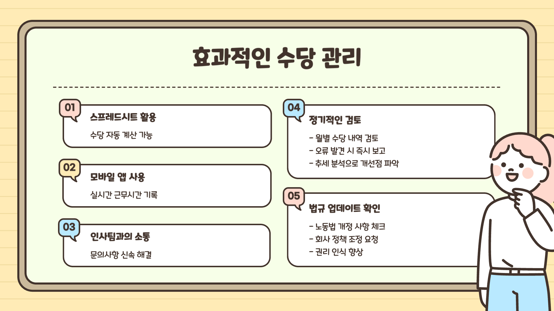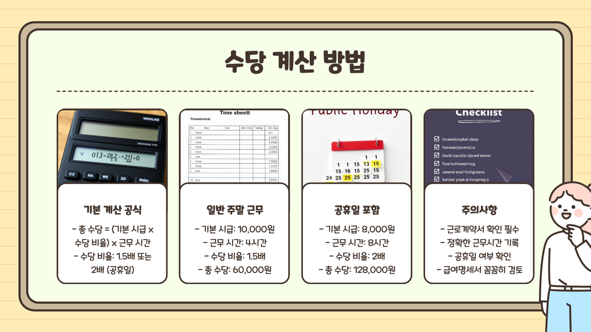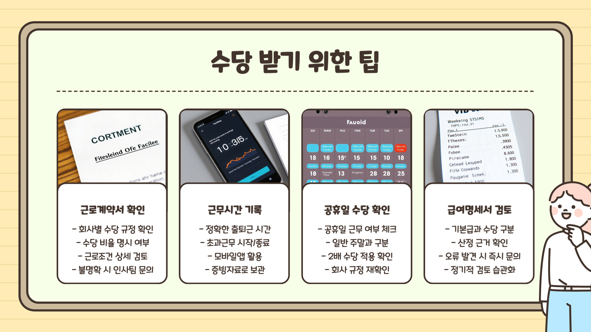 - 공휴일 수당 적용 여부를 확인하세요. 공휴일에 근무하면 일반적으로 2배 수당이 적용됩니다.