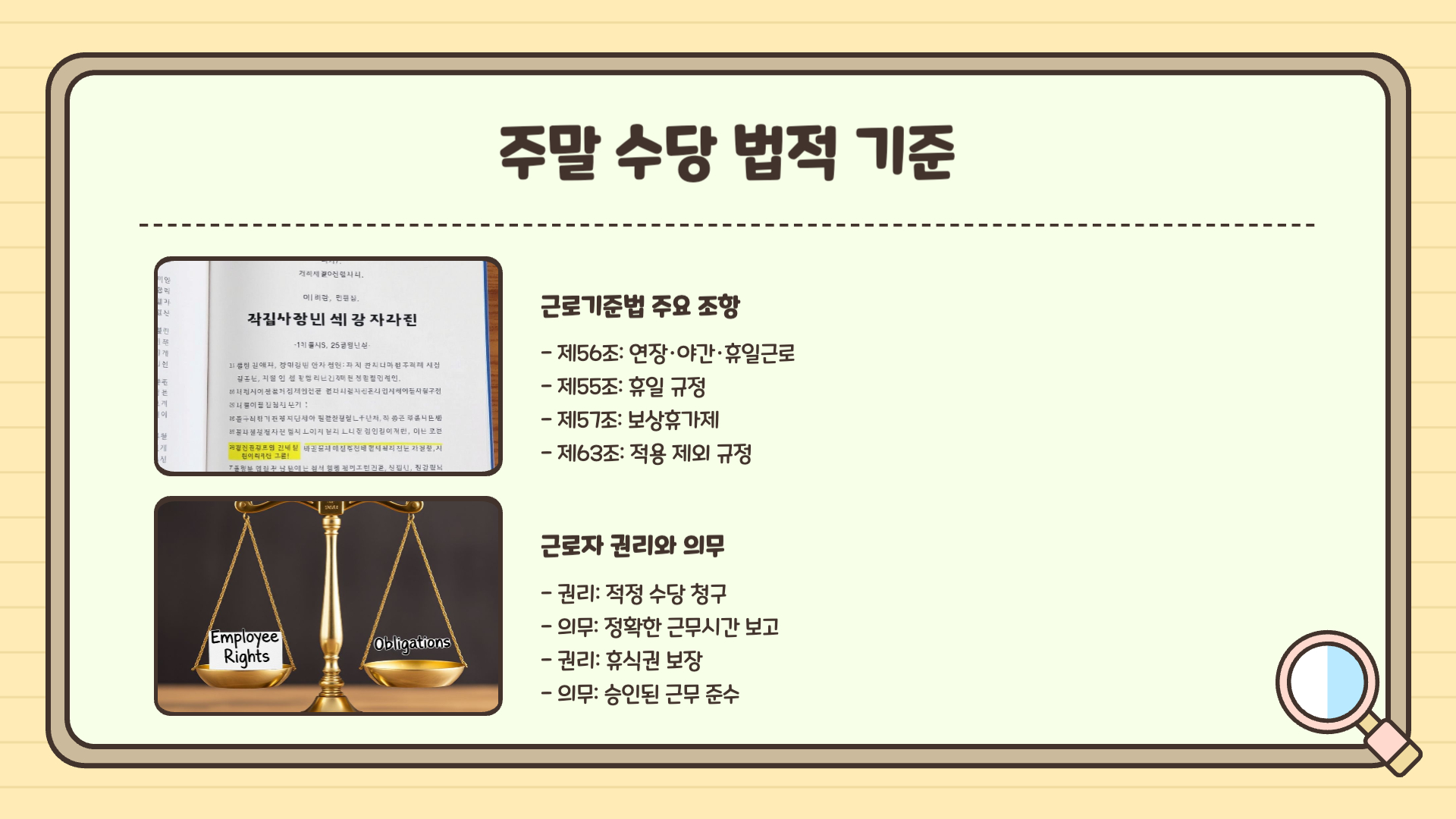 주말 근무 수당은 단순한 개념이지만, 정확한 계산법을 알고 있어야 받을 수 있는 금액을 놓치지 않습니다. 자신의 권리를 지키기 위해 근로계약서를 확인하고, 근무 기록을 남기며, 수당 지급 내역을 꼼꼼히 체크하는 것이 중요합니다.