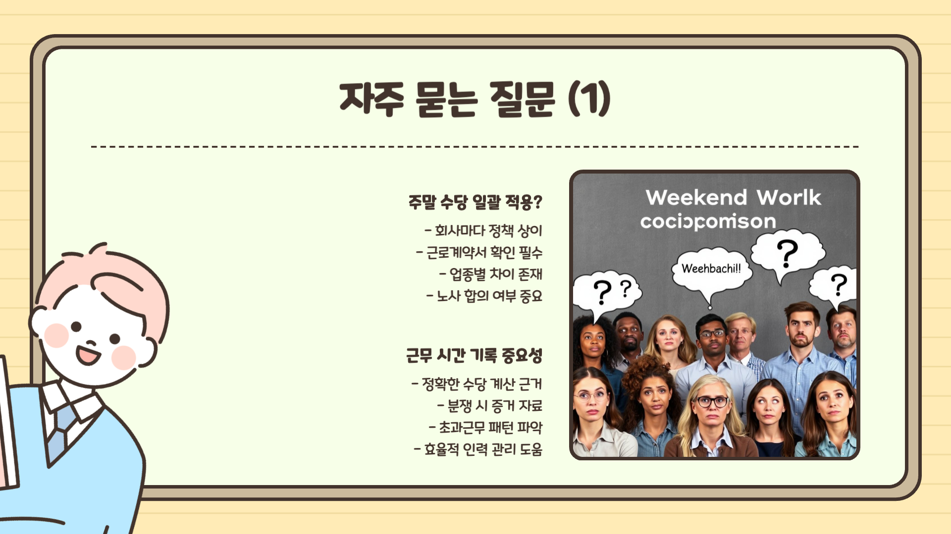 Q1: 주말 근무 수당은 모든 직장에 동일하게 적용되나요?