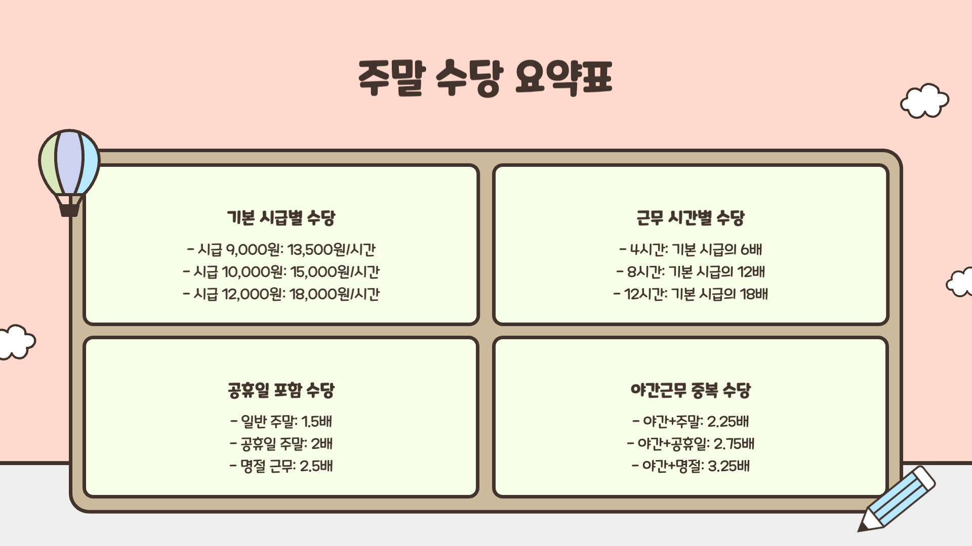- 기본 시급의 1.5배 적용 (일반적인 주말 근무 수당 비율)