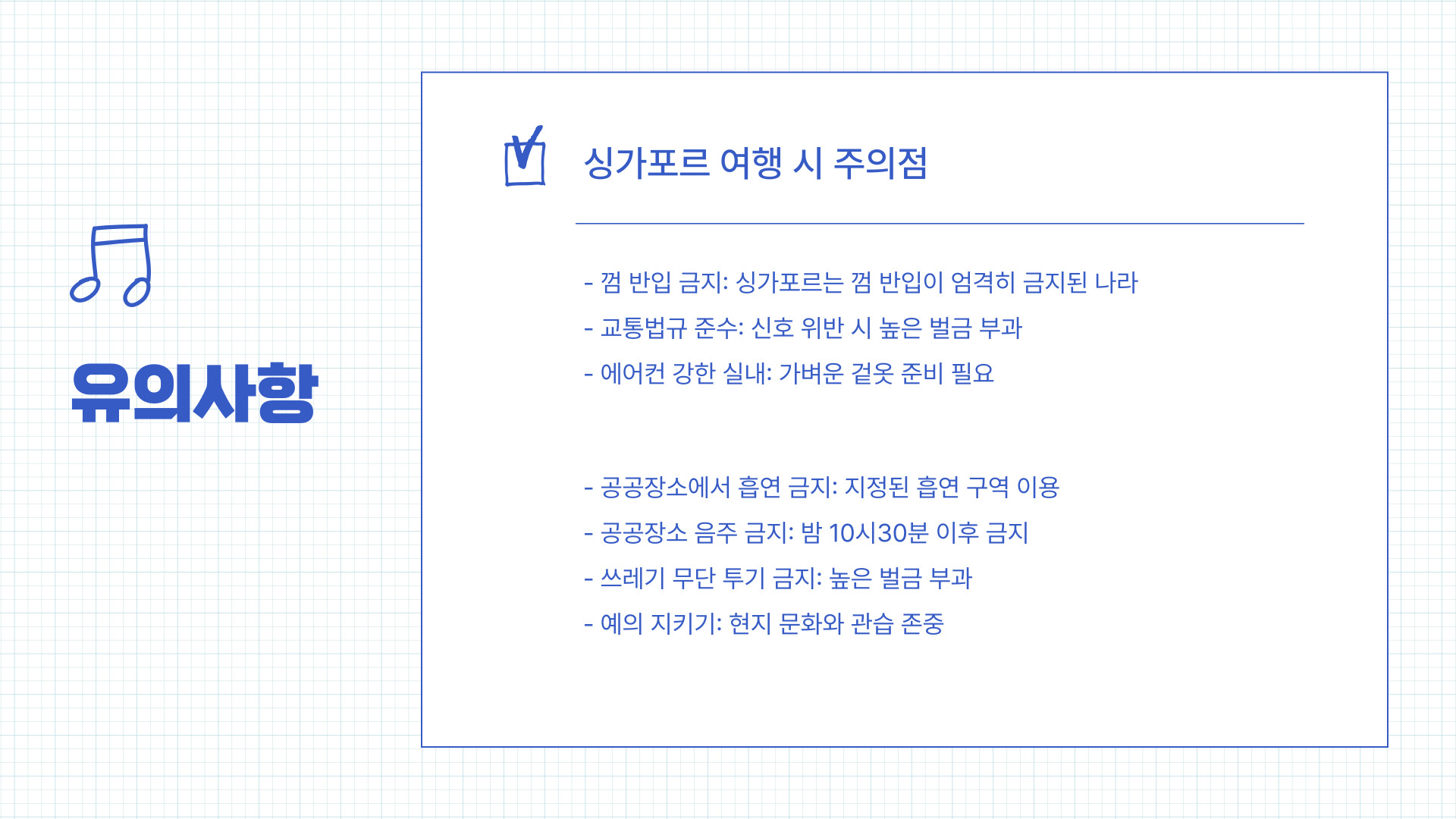- 껌 반입 금지: 싱가포르는 껌 반입이 금지된 나라입니다.