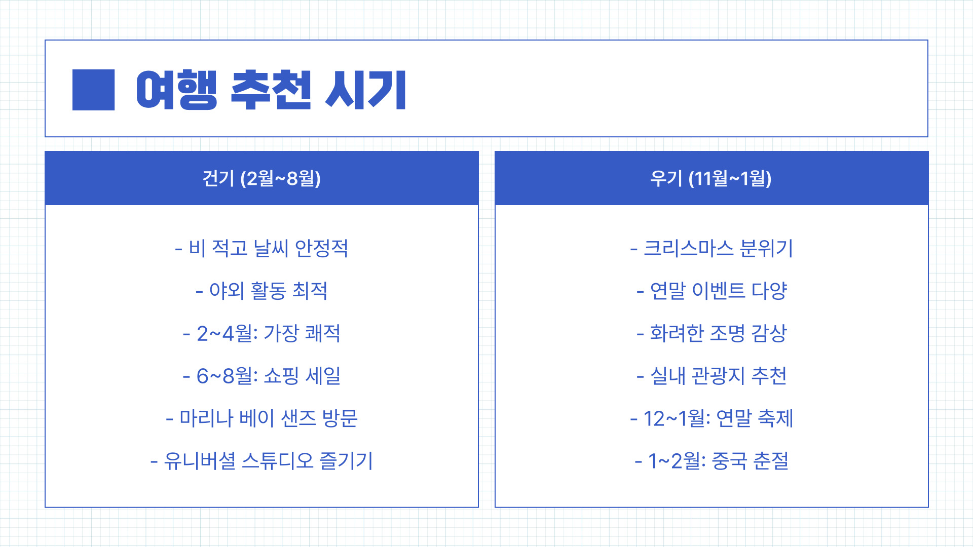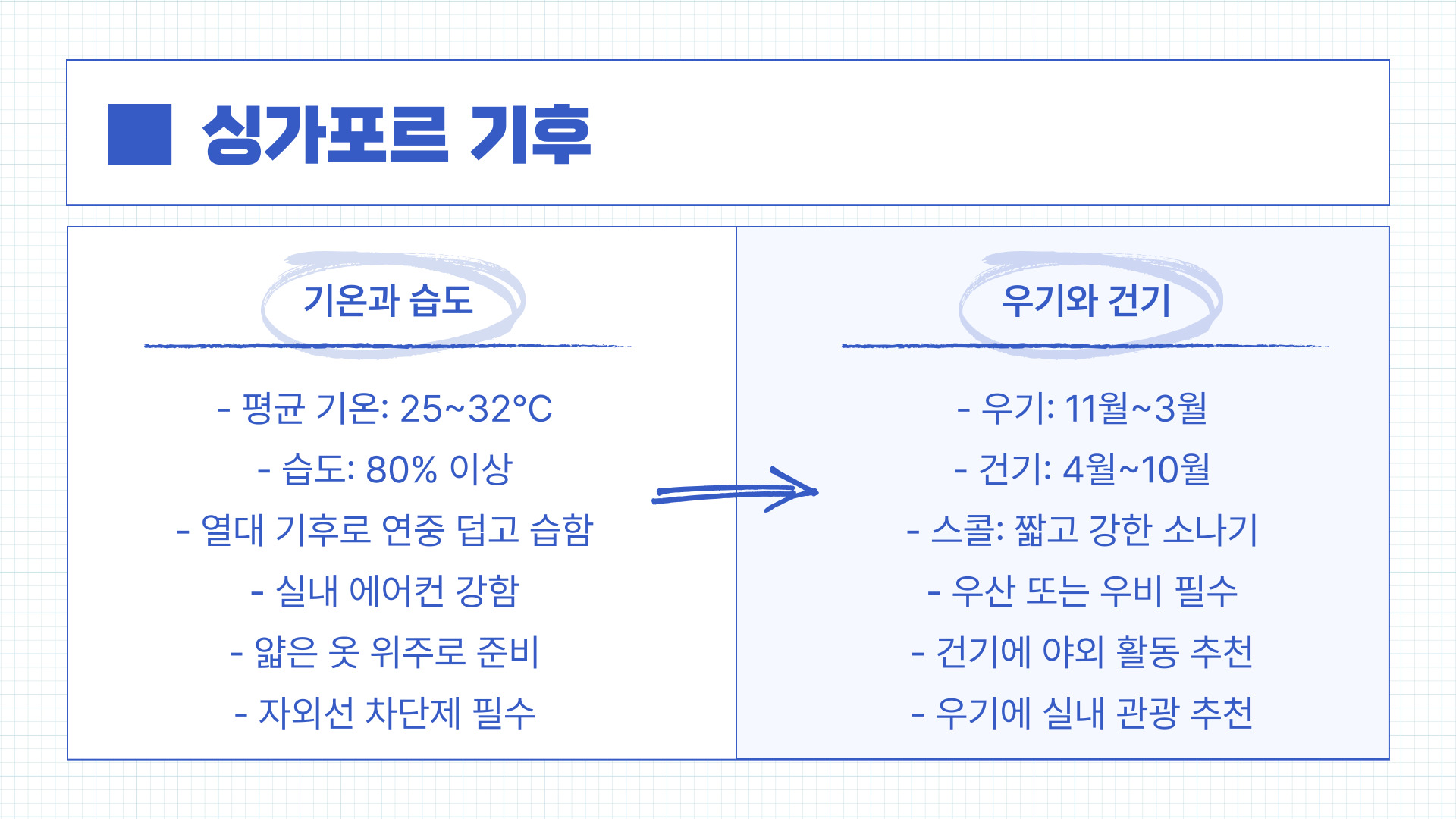 싱가포르는 연중 덥고 습한 열대 기후를 가지고 있어 사계절이 뚜렷하지 않습니다. 하지만 여행하기 좋은 시기가 따로 있으며, 비가 적고 날씨가 쾌적한 건기를 선택하면 더욱 즐거운 여행이 가능합니다. 이번 포스팅에서는 싱가포르 여행하기 좋은 계절과 추천 명소에 대해 자세히 알아보겠습니다.
