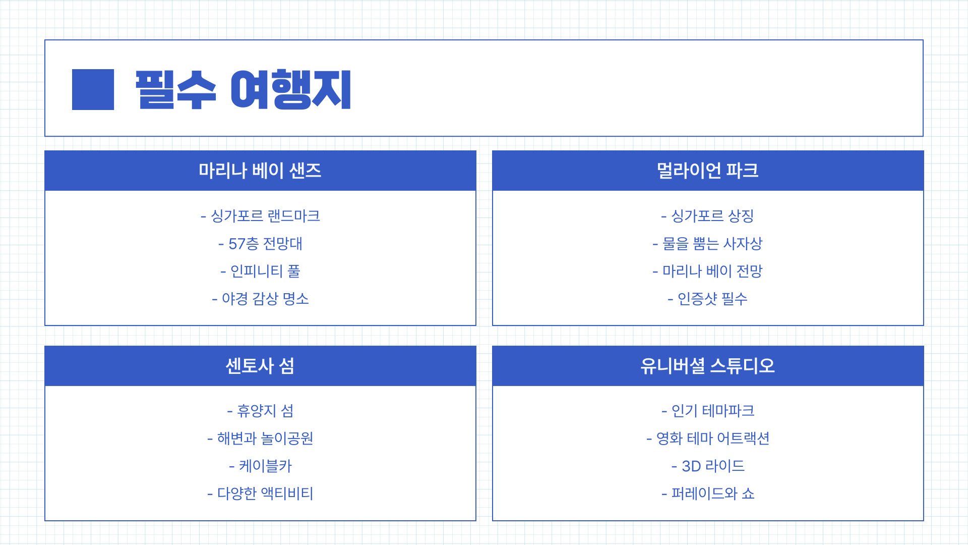 싱가포르는 작은 도시지만 다양한 볼거리와 즐길 거리가 가득한 여행지입니다. 건기에는 야외 관광을, 우기에는 실내 관광을 계획하면 더욱 쾌적한 여행이 가능합니다. 싱가포르에서 멋진 추억을 만들어보세요!