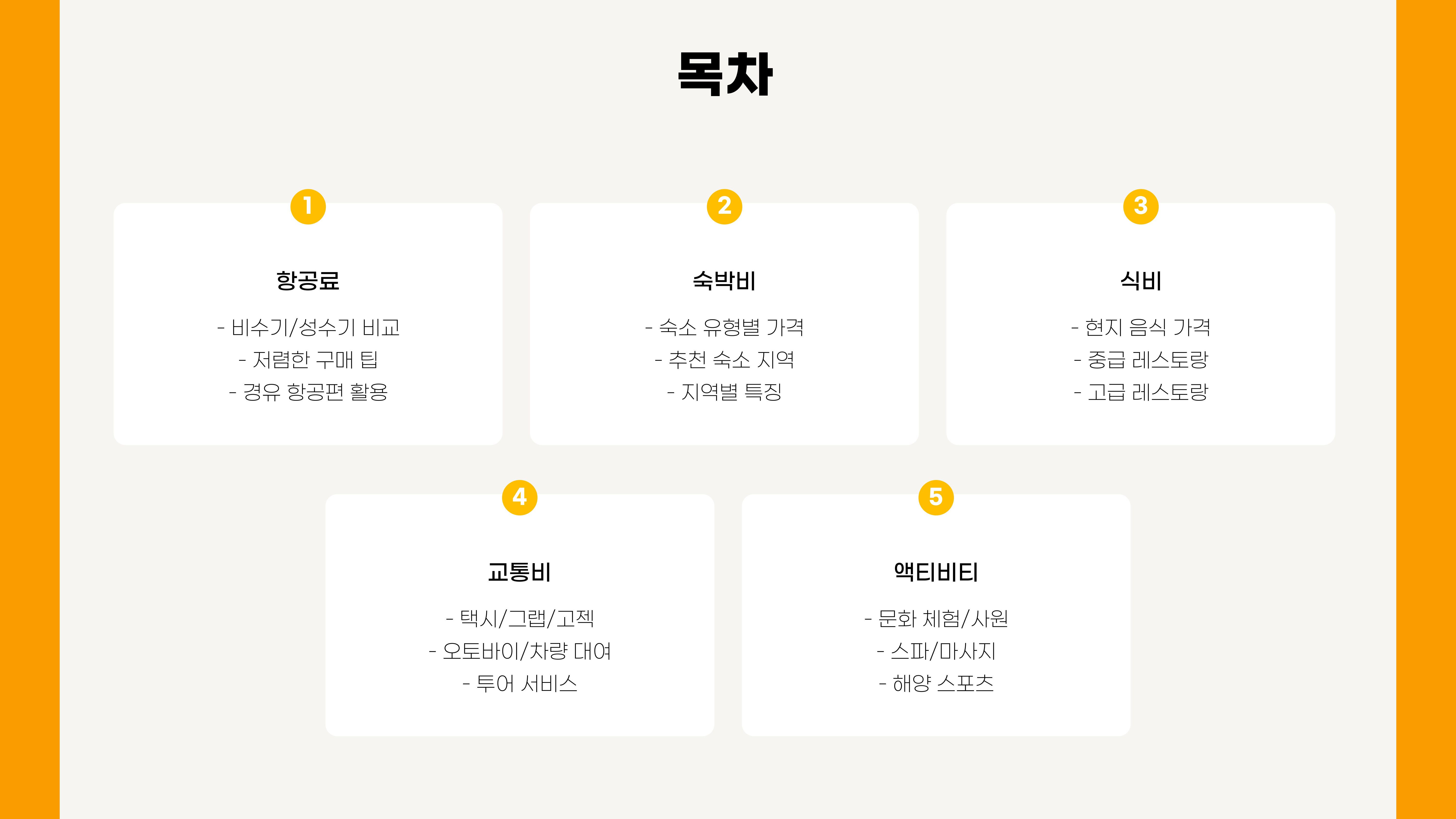 - 비수기 여행: 2~5월, 9~11월에 방문하면 항공료 및 숙박비 절감