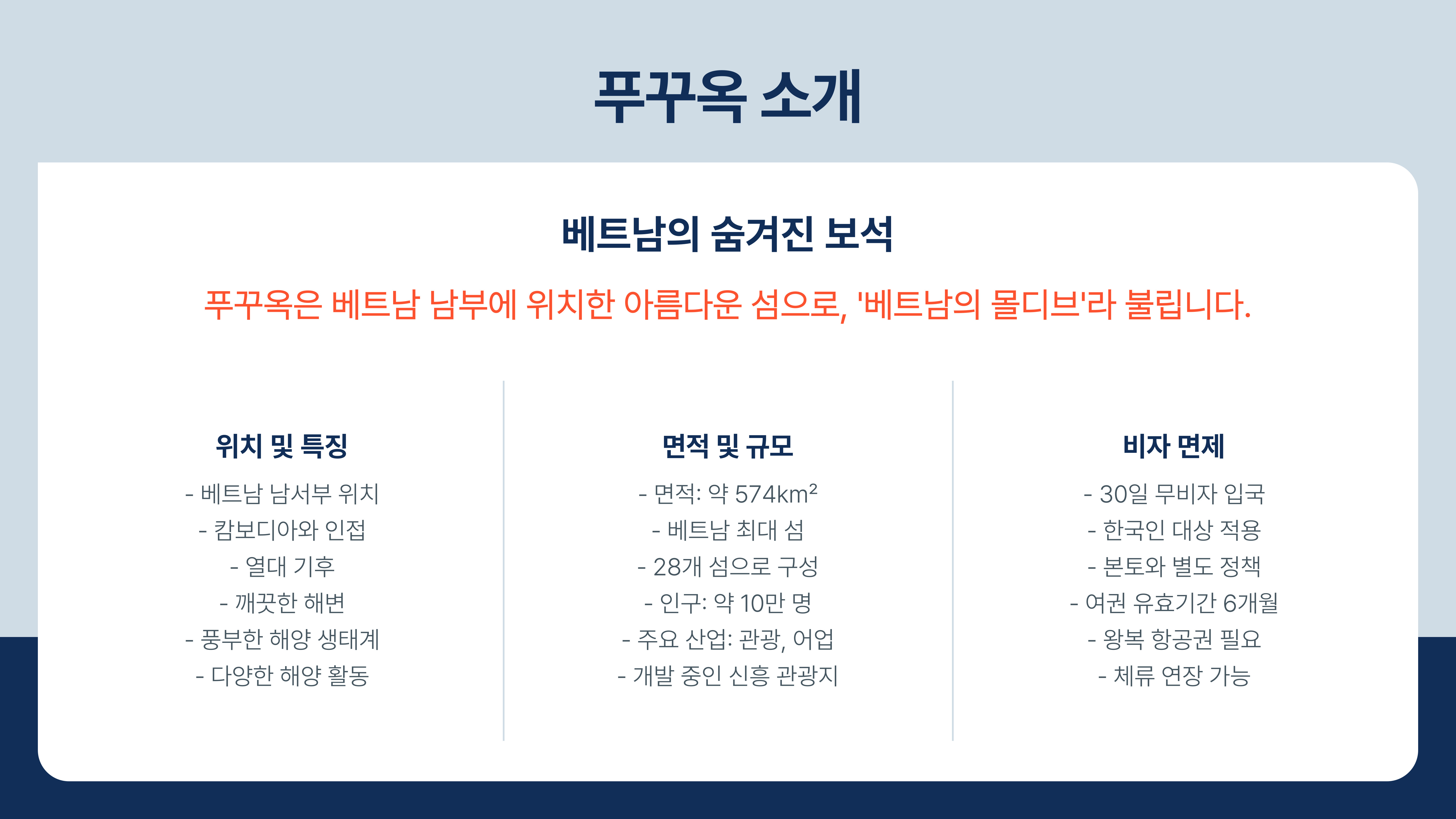 - 특징: 비자 면제(30일) 적용 가능 (베트남 본토와는 별도 정책 운영)