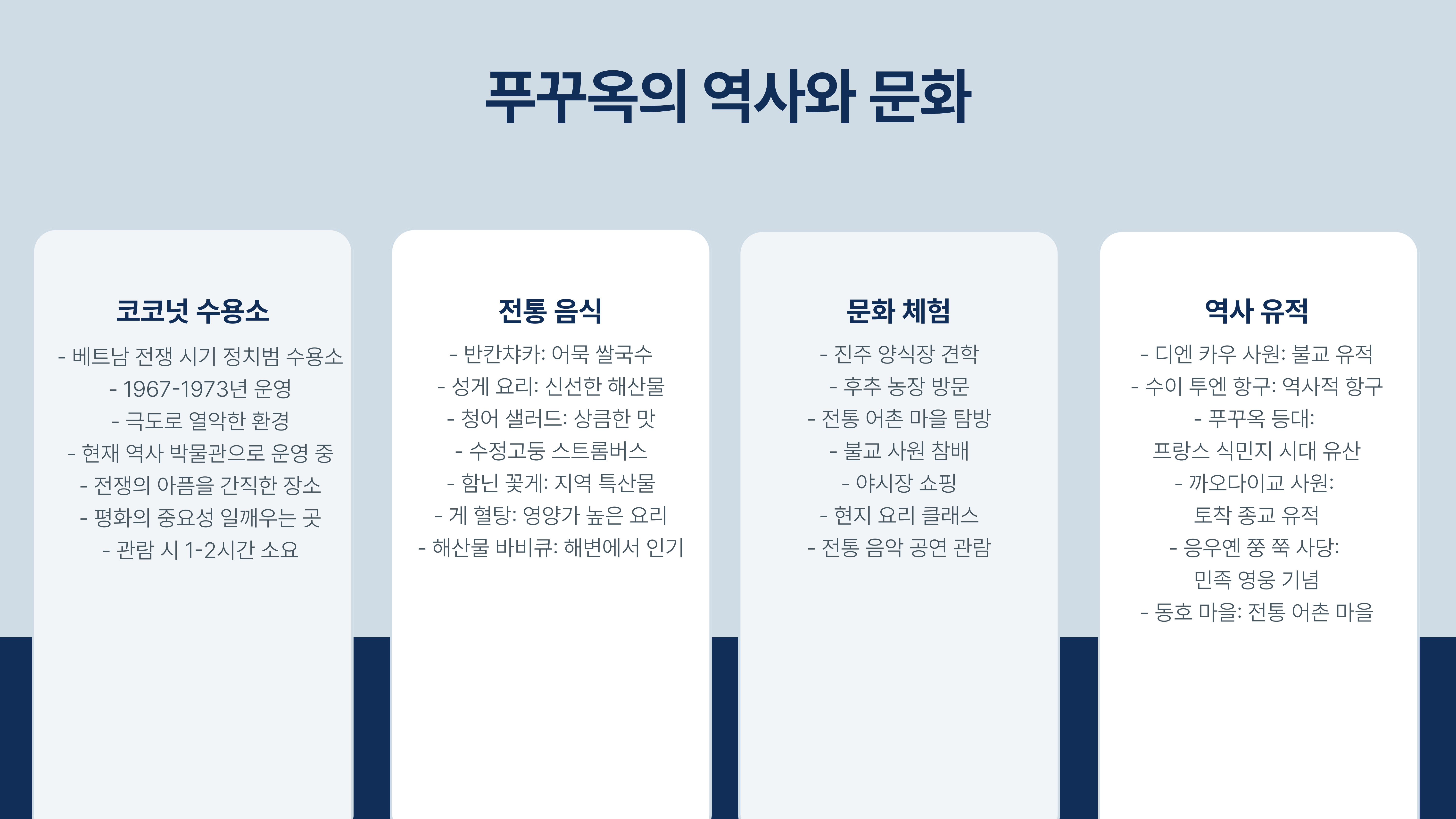 - 오전: 남부 코코넛 감옥 (Phu Quoc Prison) 방문하여 역사 탐방