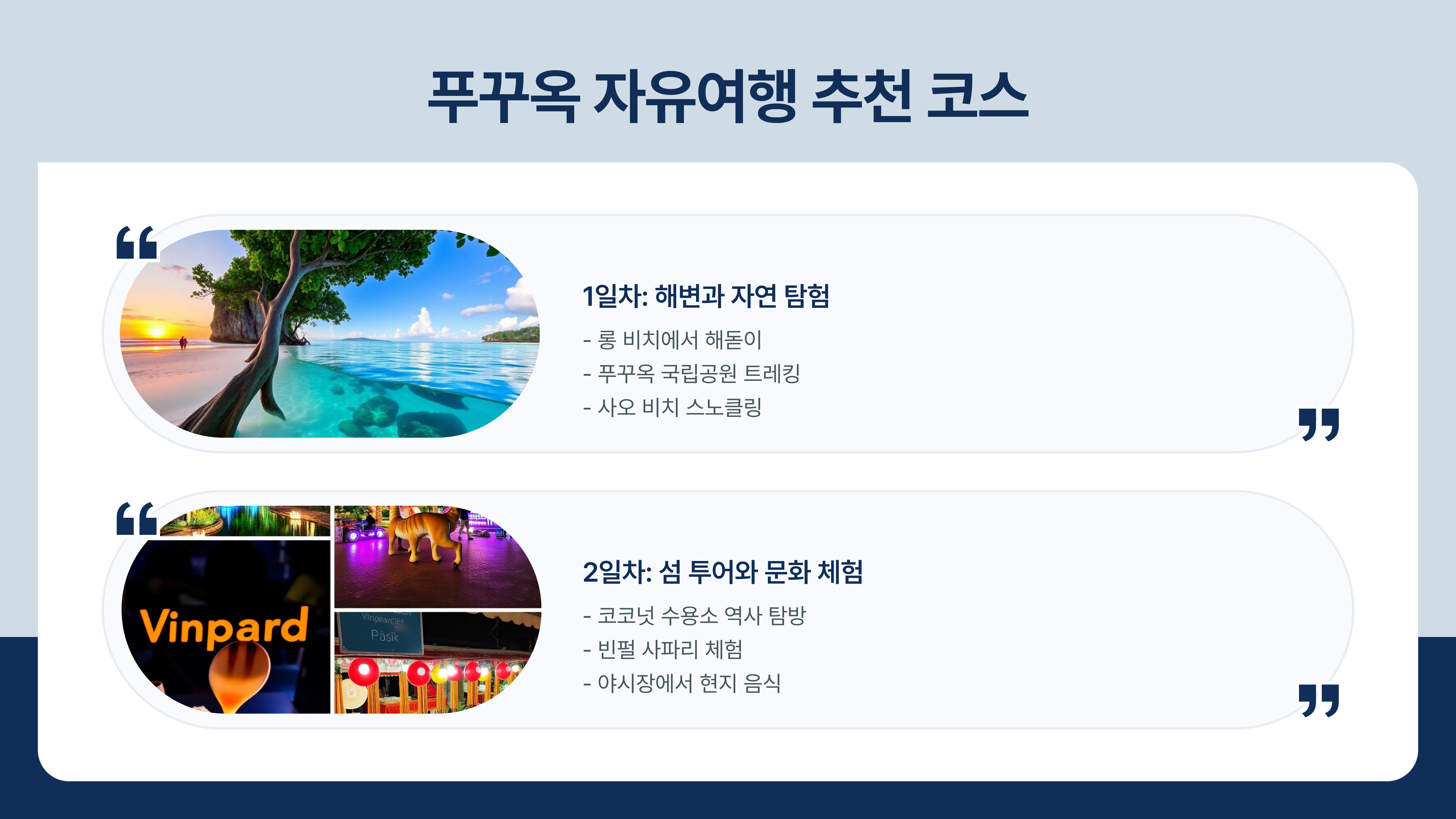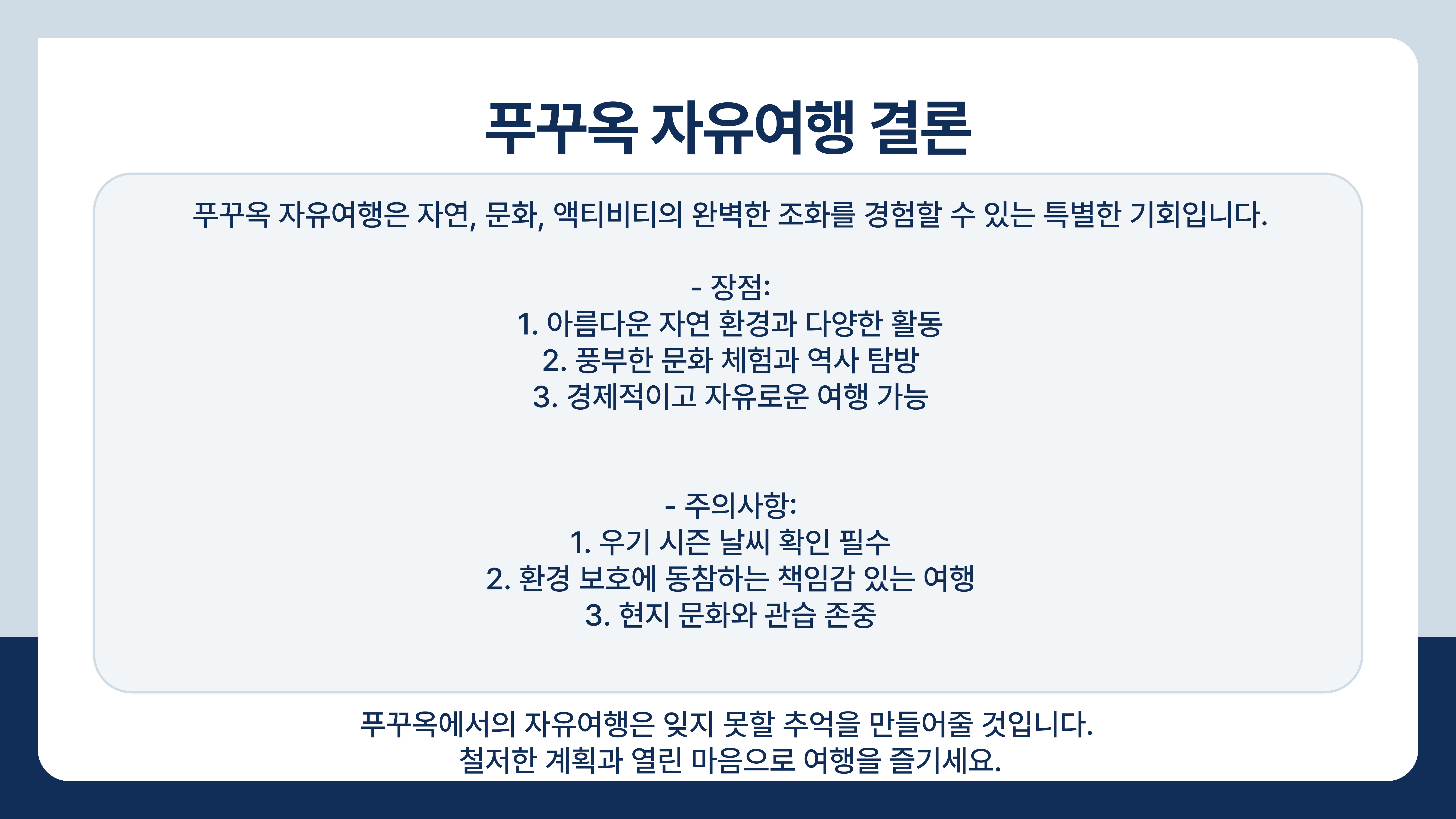 푸꾸옥은 단순한 휴양지가 아니라 다양한 액티비티와 문화 체험을 동시에 즐길 수 있는 특별한 섬입니다. 일정과 예산을 잘 계획하여 자유로운 여행을 떠나보세요. 이번 포스팅이 푸꾸옥 자유여행을 계획하는 분들에게 유익한 정보가 되었길 바랍니다.