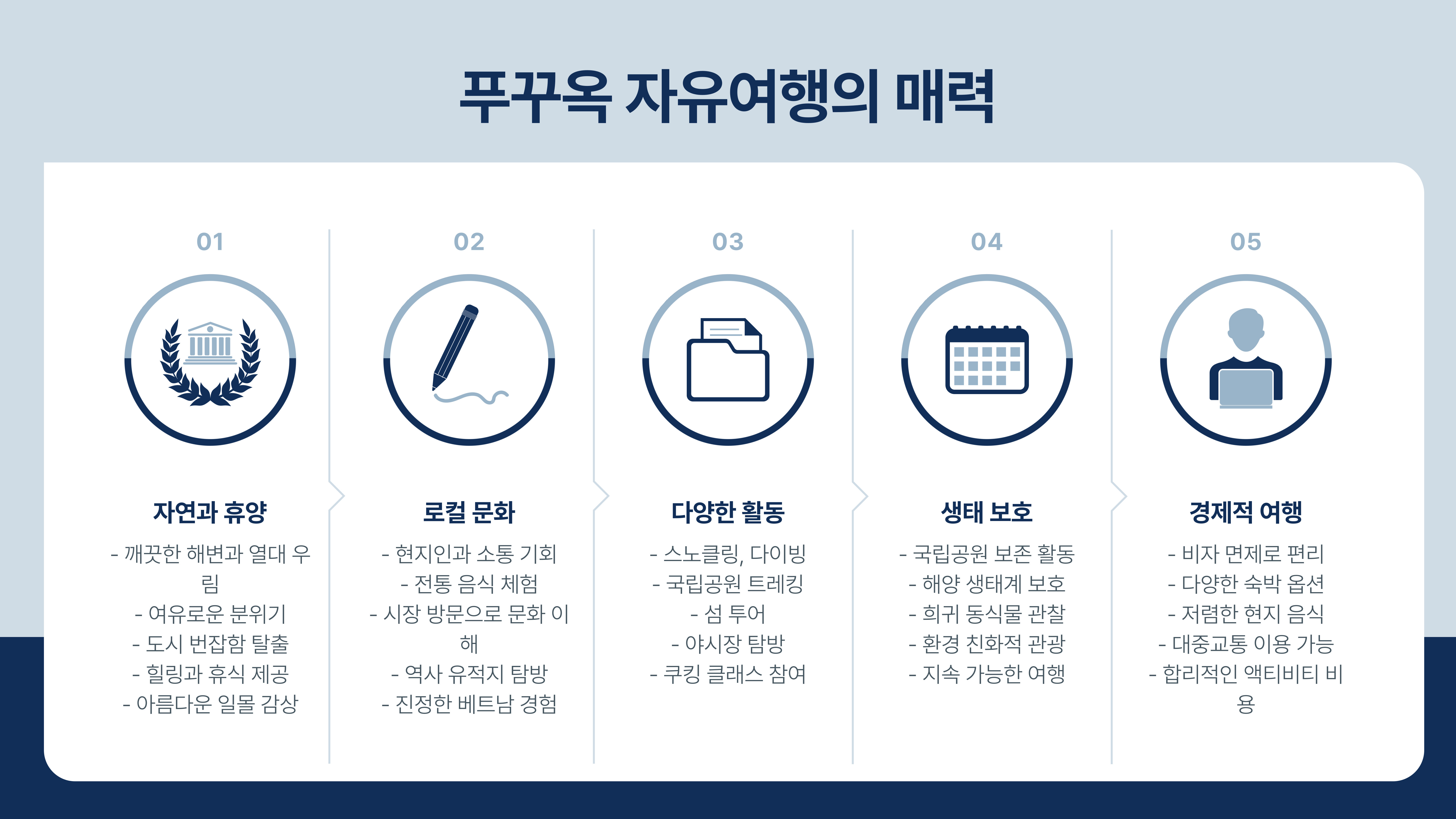 푸꾸옥은 깨끗한 자연환경과 여유로운 분위기가 조화를 이루는 여행지입니다. 특히, 대도시의 번잡함을 피해 힐링을 원하는 여행자들에게 적합합니다. 또한, 현지인과의 소통을 통해 베트남의 로컬 문화를 직접 체험할 수 있는 것도 푸꾸옥 자유여행의 큰 매력입니다.