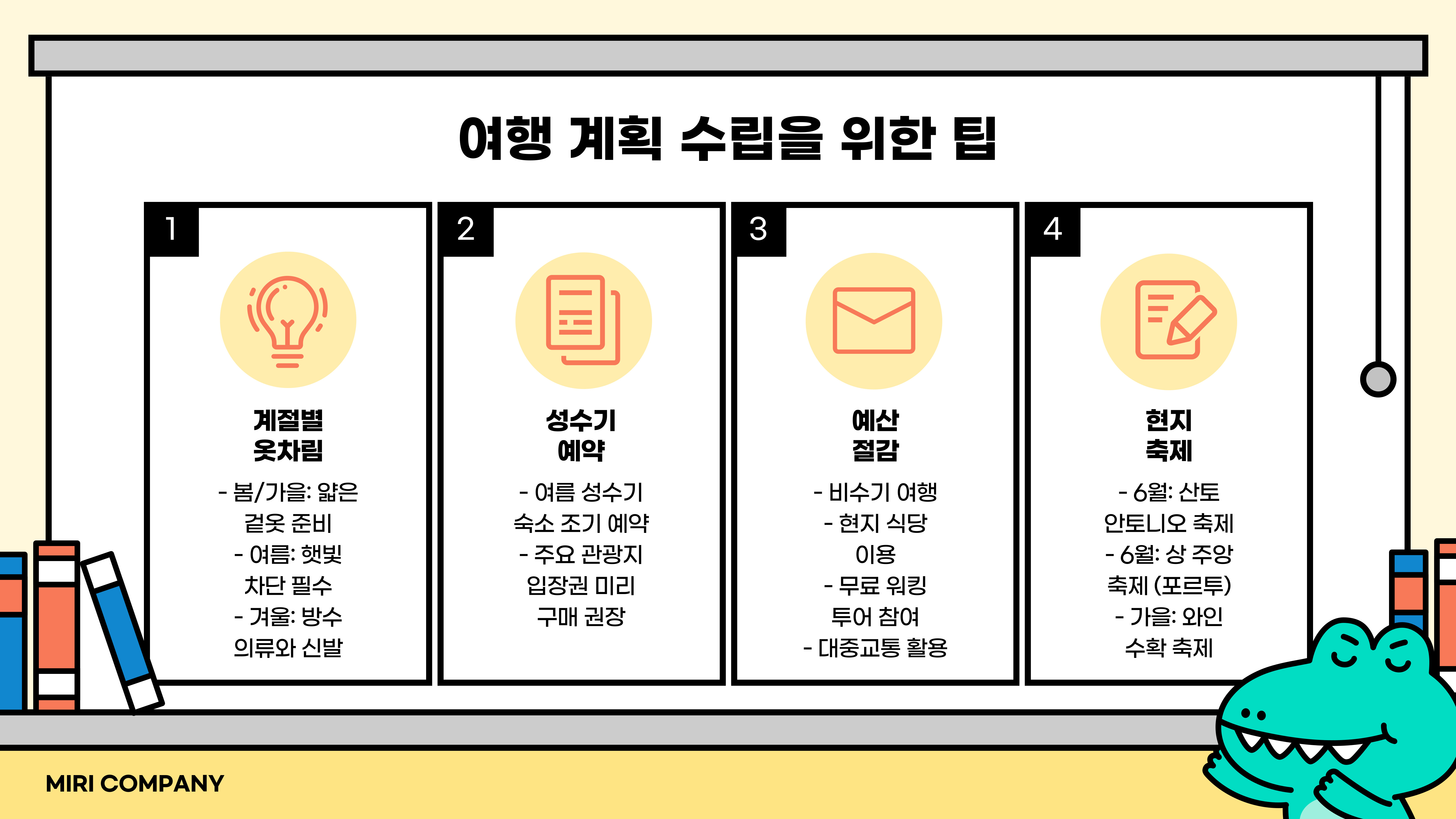 - 성수기를 피해 여행하면 숙박비 및 항공권 비용을 절약 가능