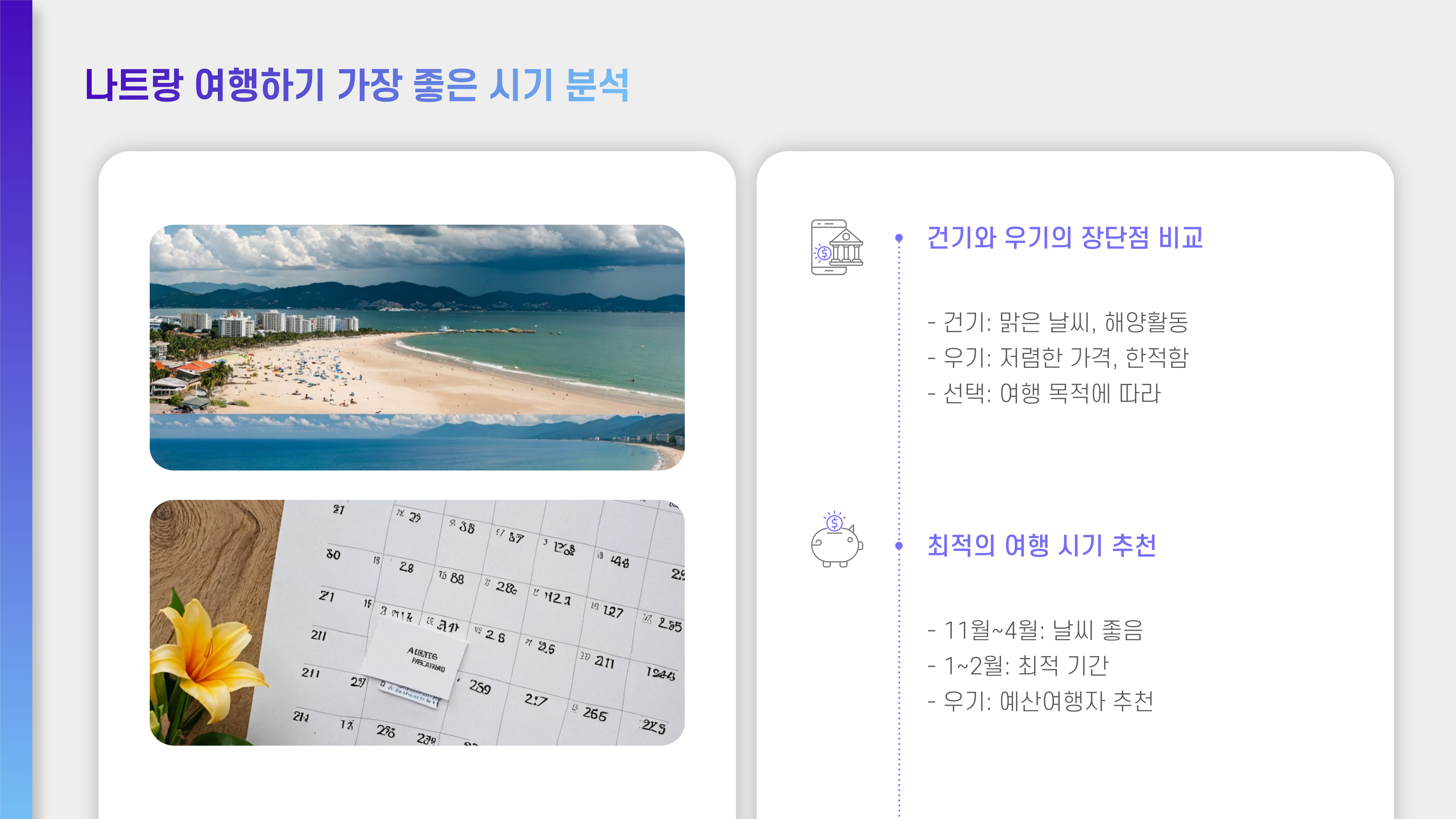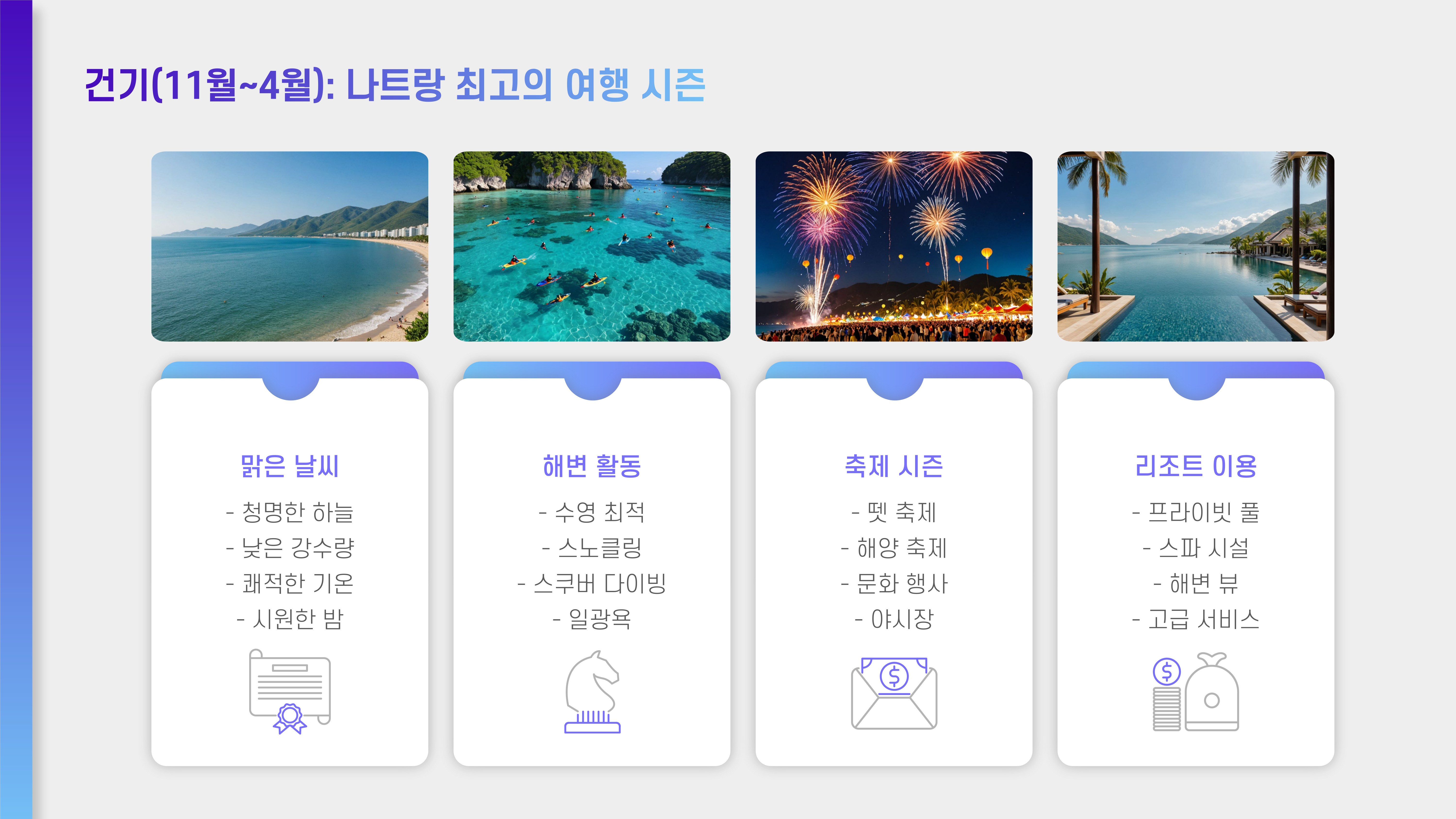 나트랑은 사계절 내내 아름다운 여행지이지만, 목적과 스타일에 맞는 최적의 시기를 선택하는 것이 중요합니다.