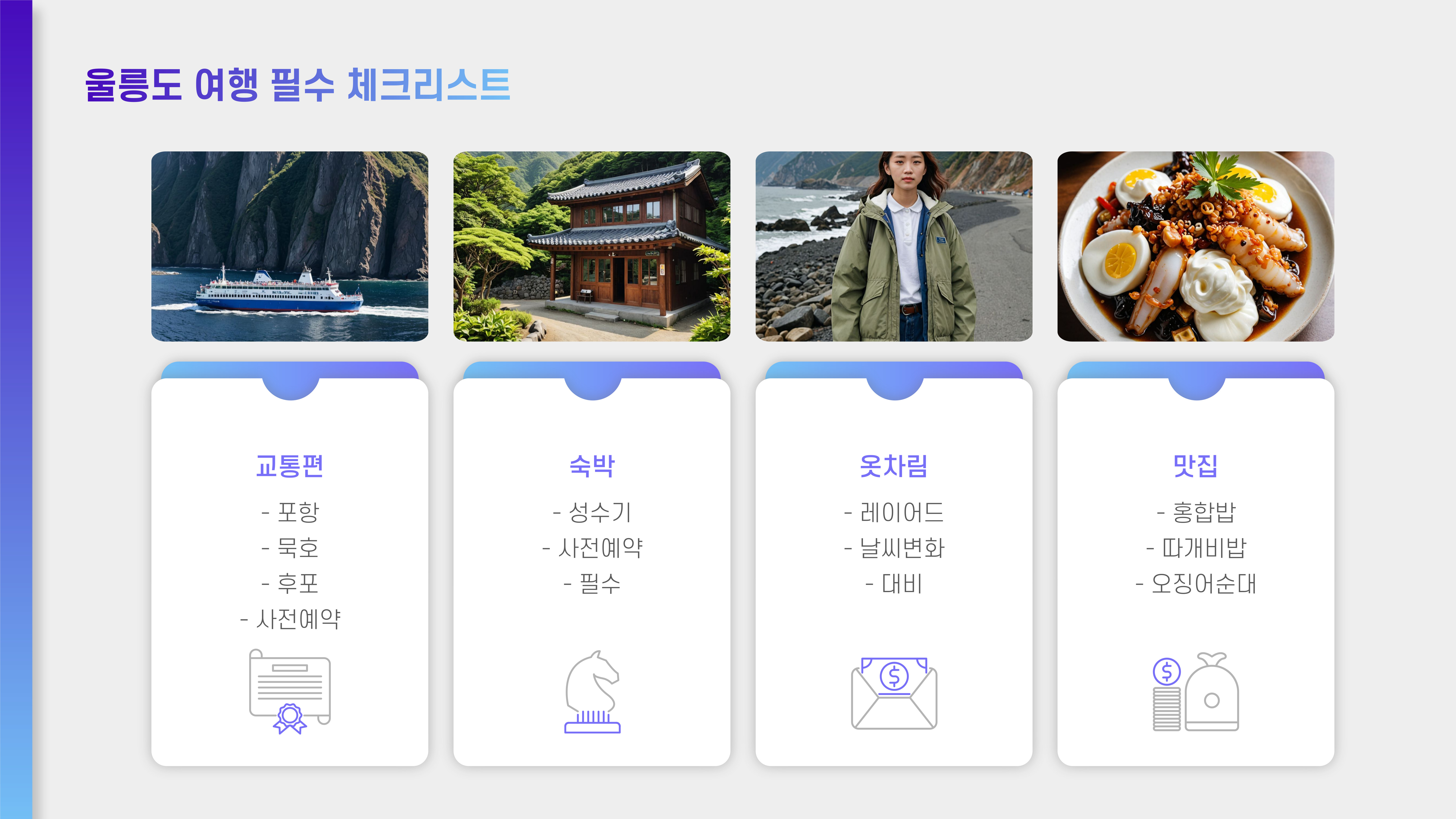 - 맛집: 울릉도 대표 음식(홍합밥, 따개비밥, 오징어순대)은 꼭 맛볼 것!