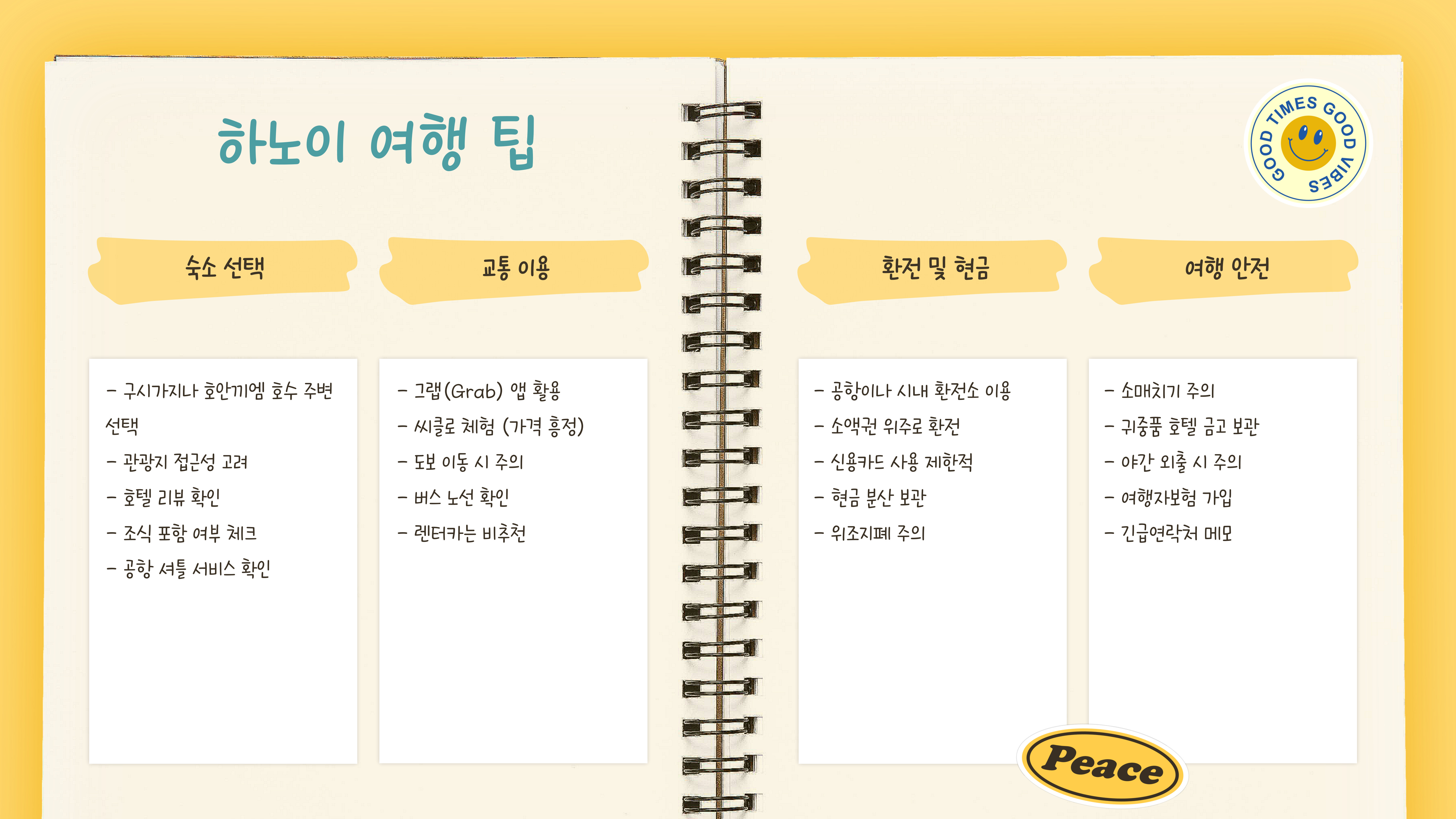 - 숙소 선택: 하노이 구시가지(Old Quarter)나 호안끼엠 주변이 관광하기 편리