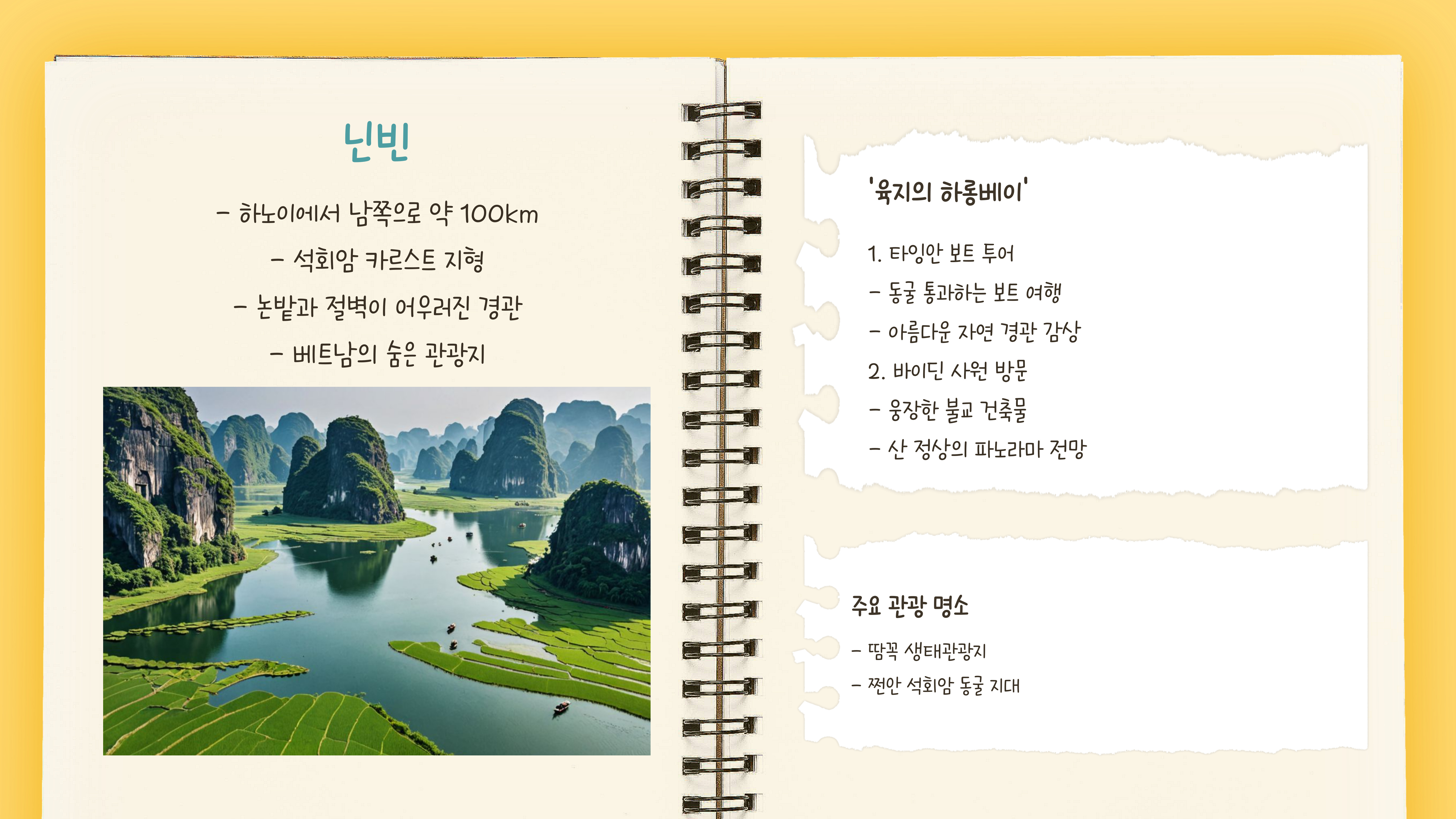 '육지의 하롱베이'라 불리며, 논밭과 석회암 절벽이 어우러진 경관이 특징입니다.
