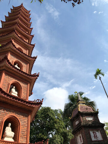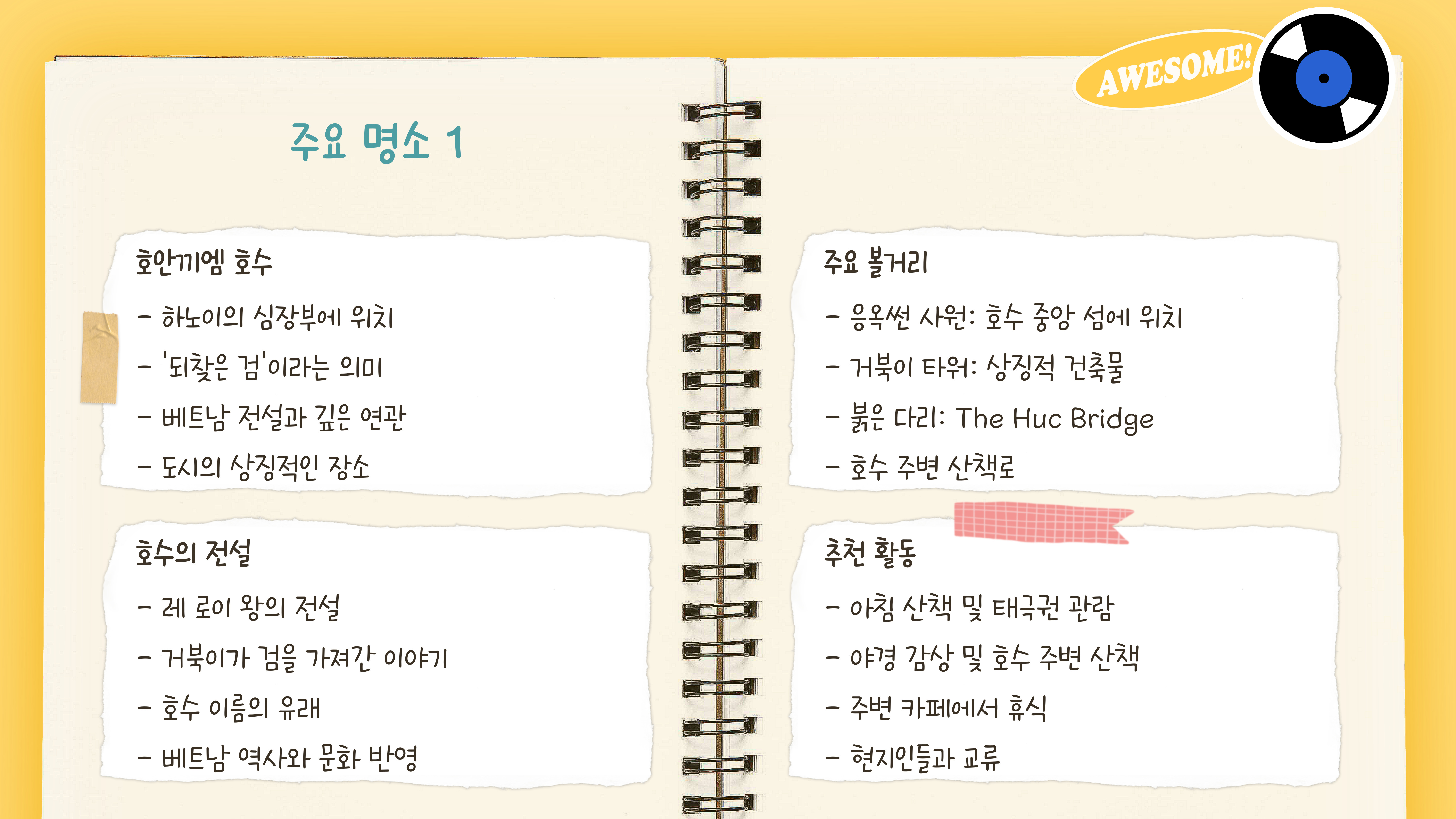- 응옥썬 사원: 호수 중앙의 작은 섬 위에 위치한 사원으로, 붉은 다리를 통해 접근 가능