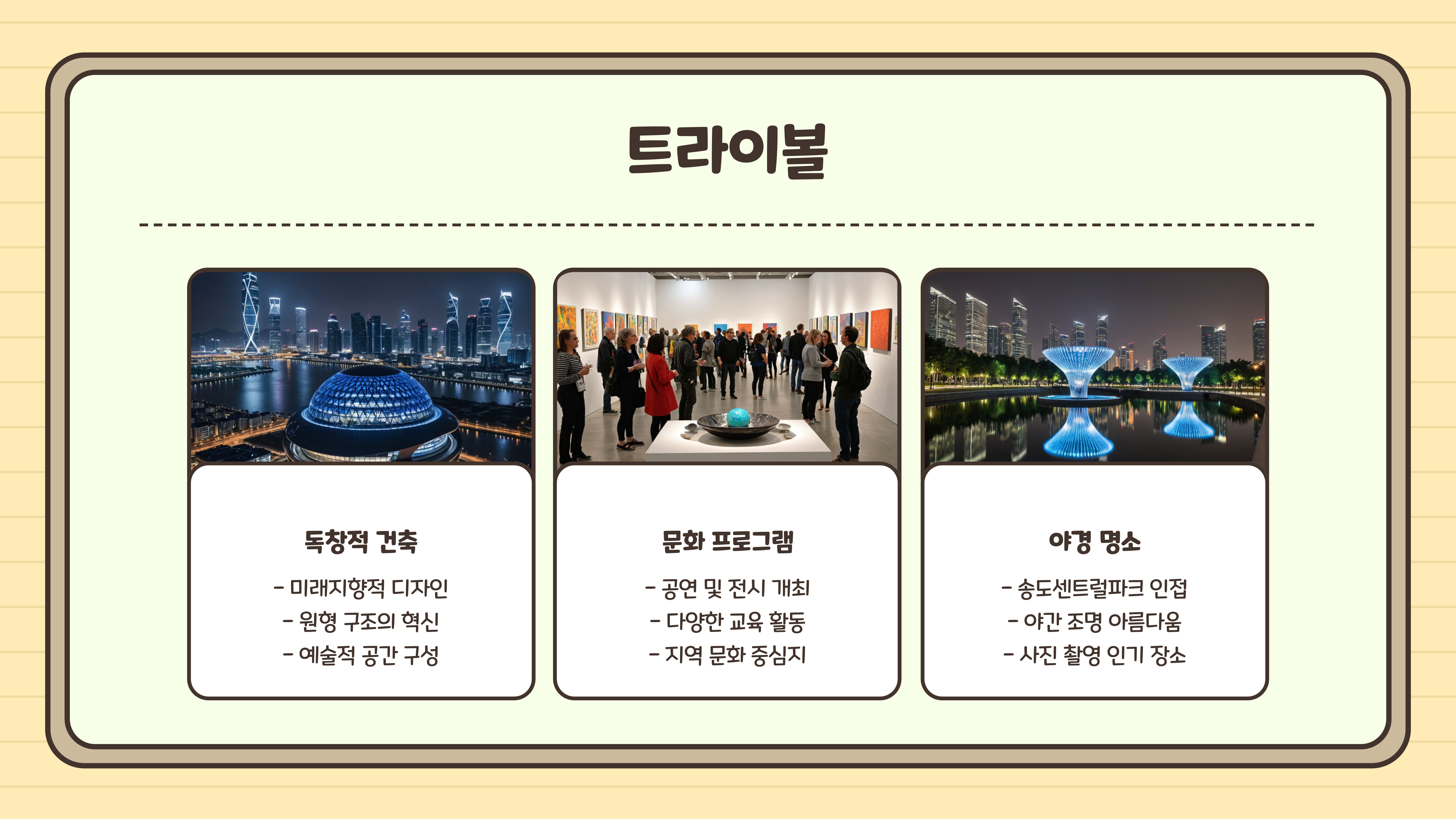 트라이볼은 독창적인 건축 디자인과 예술적인 공간이 결합된 복합문화공간입니다. 인천문화재단이 운영하며, 공연, 전시, 교육 프로그램이 정기적으로 진행됩니다. 송도센트럴파크와 인접해 있어 야경을 감상하기에도 좋은 장소입니다.