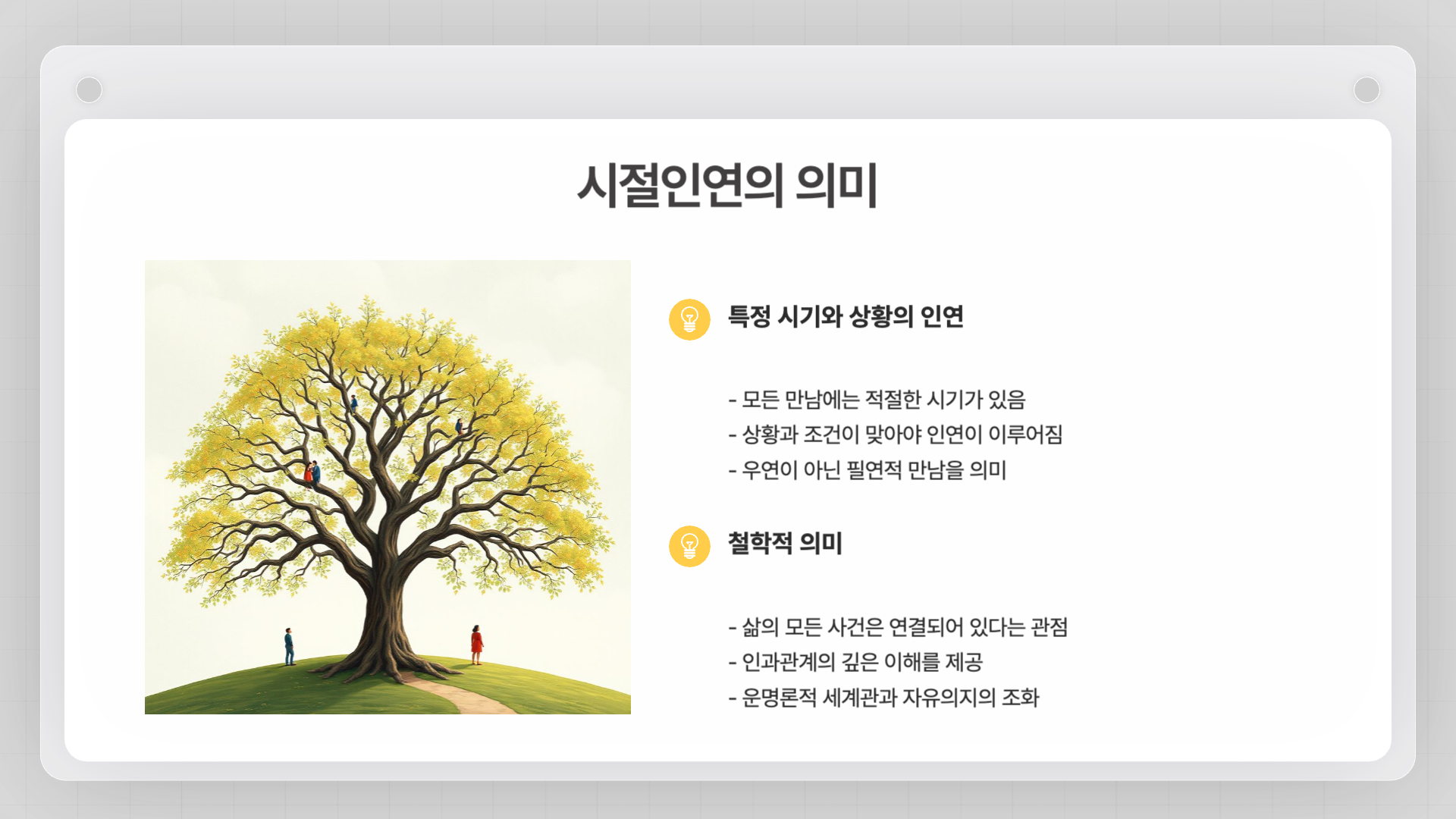 특정한 시기와 상황에서 이루어지는 인연을 의미합니다. 우리가 살아가면서 만나는 모든 사람과의 관계가 단순한 우연이 아닌, 각자의 시기와 조건에 따라 자연스럽게 이루어진 것이라는 깊은 철학적 의미를 담고 있습니다.