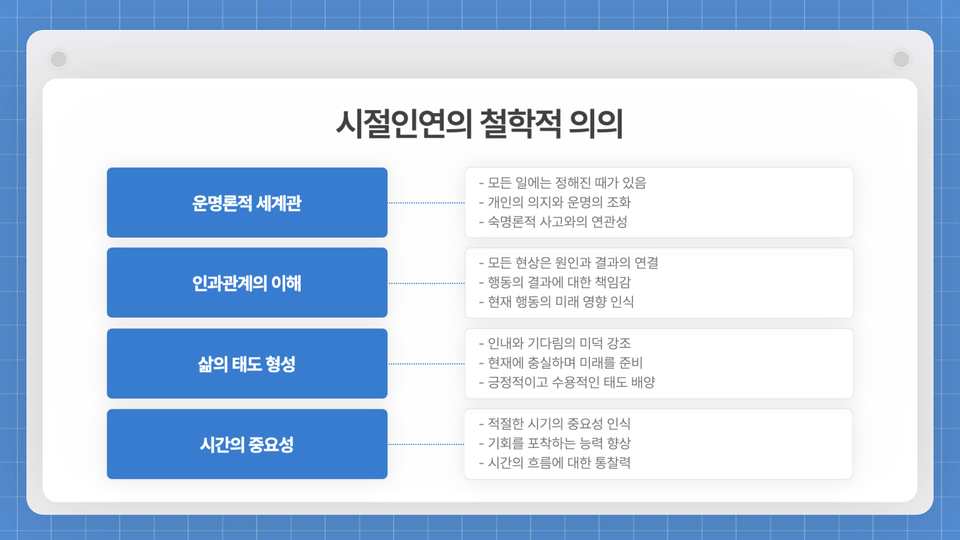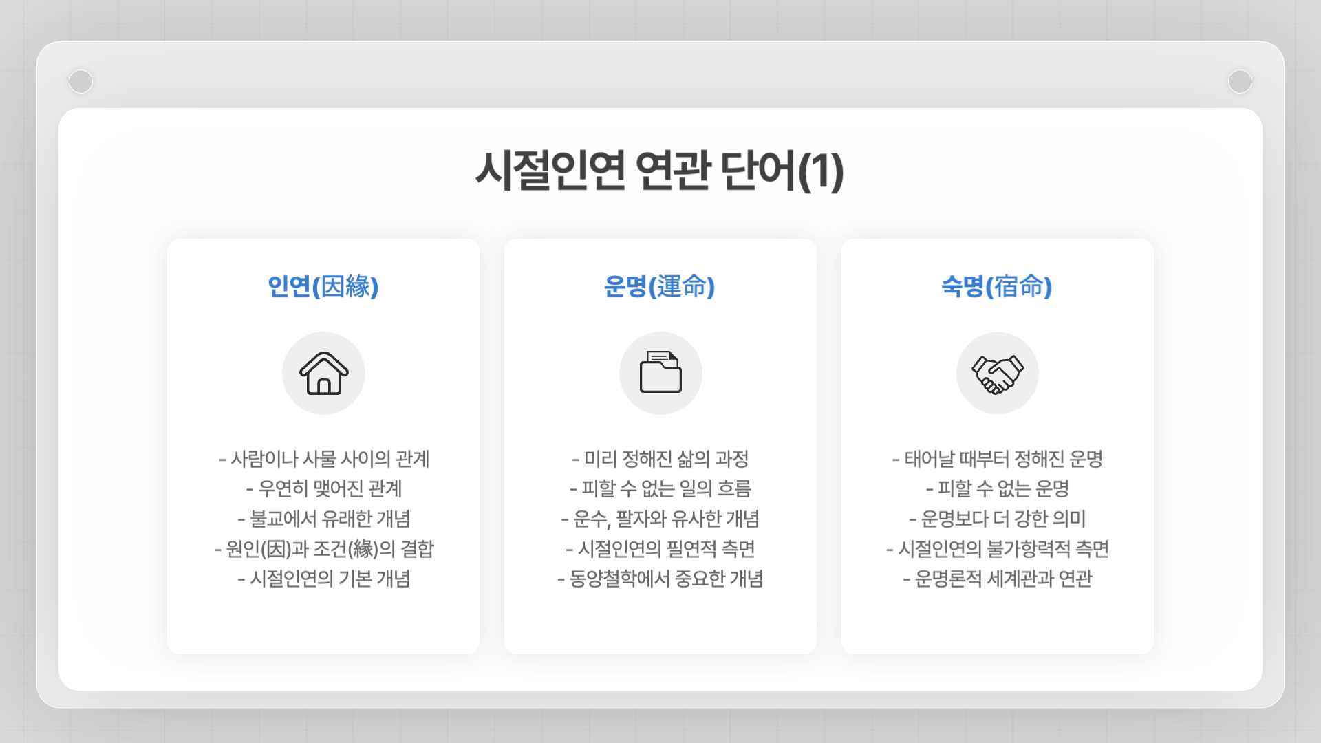 - 인연(因緣): 사람이나 사건 간의 관계나 연결을 의미합니다.
