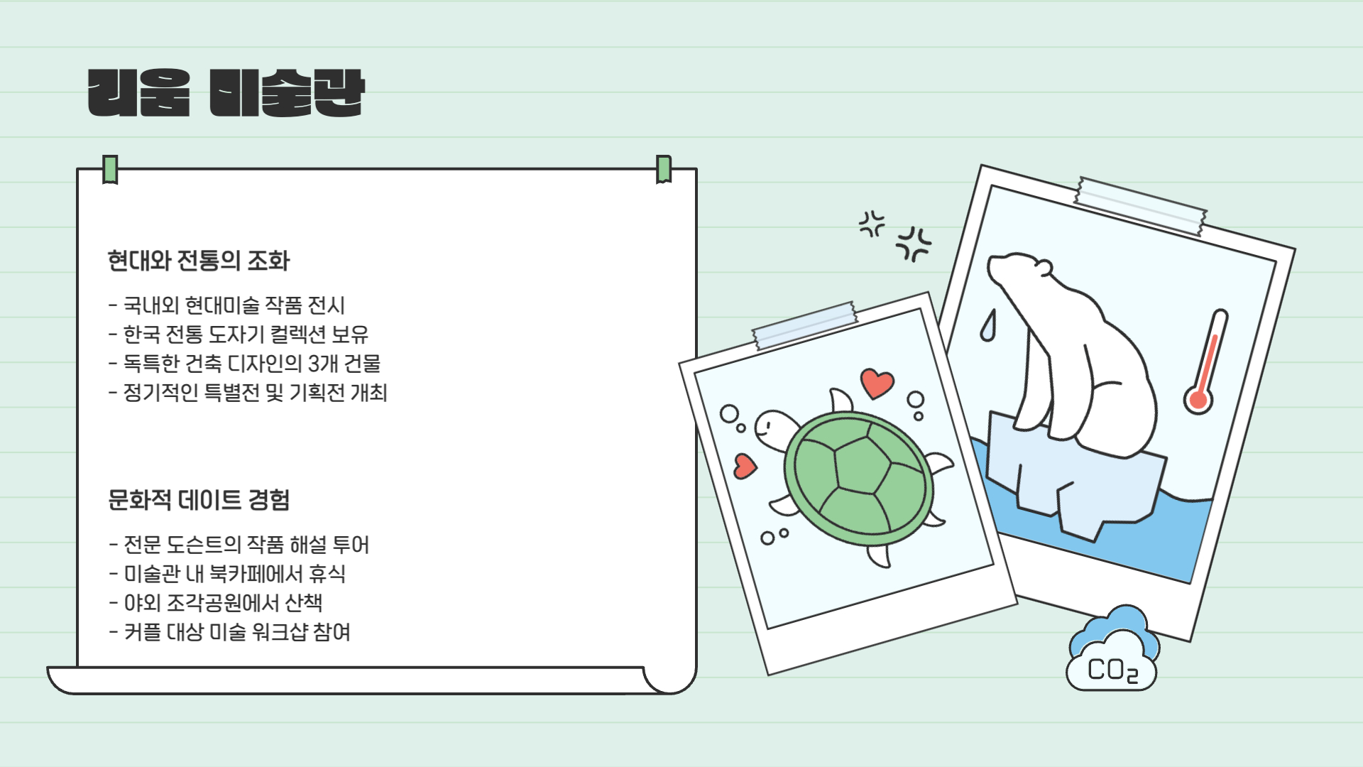 - 리움 미술관: 현대 미술과 전통 미술이 조화를 이루는 공간으로, 예술을 사랑하는 커플에게 적합합니다. 다양한 전시를 통해 문화적인 데이트를 즐길 수 있습니다.