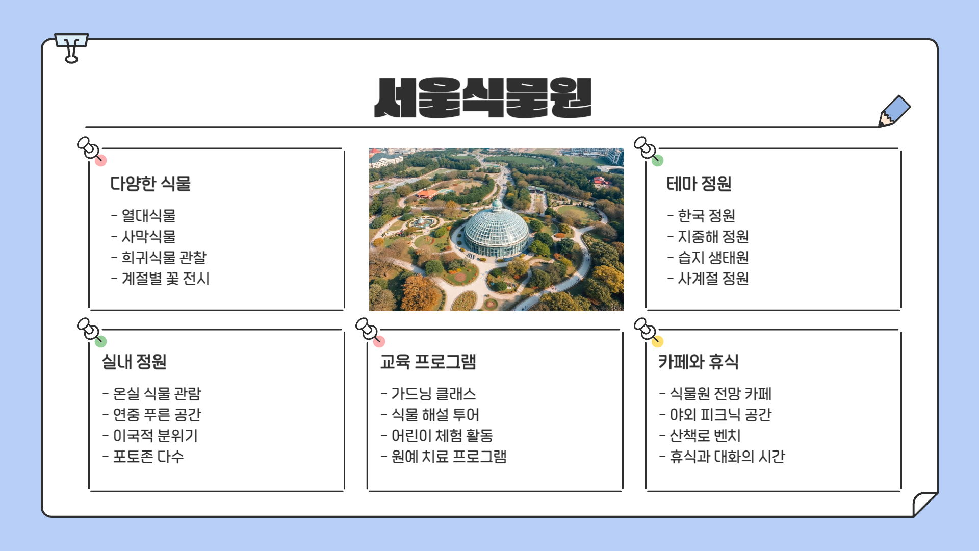 - 서울식물원: 다양한 식물과 아름다운 정원을 감상할 수 있는 공간으로, 자연 속에서의 데이트를 원하시는 분들에게 추천합니다.